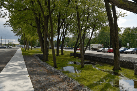 À l’aéroport de Montréal, les arbres matures existants ont été préservés et intégrés dans le design du nouveau stationnement, qui font désormais partie d’un grand bassin de biorétention au milieu du stationnement.