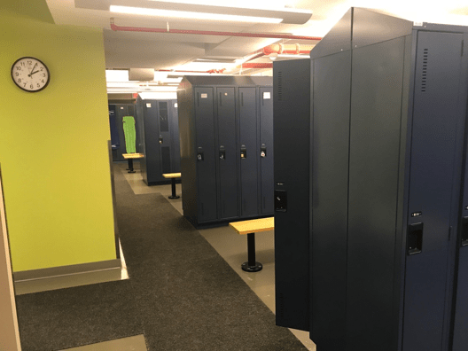 Le Complexe Desjardins, au centre-ville de Montréal, offre de nombreux atouts aux cyclistes : supports à vélos intérieurs, des bornes de réparation, et même de vastes vestiaires équipés de douches et de casiers!